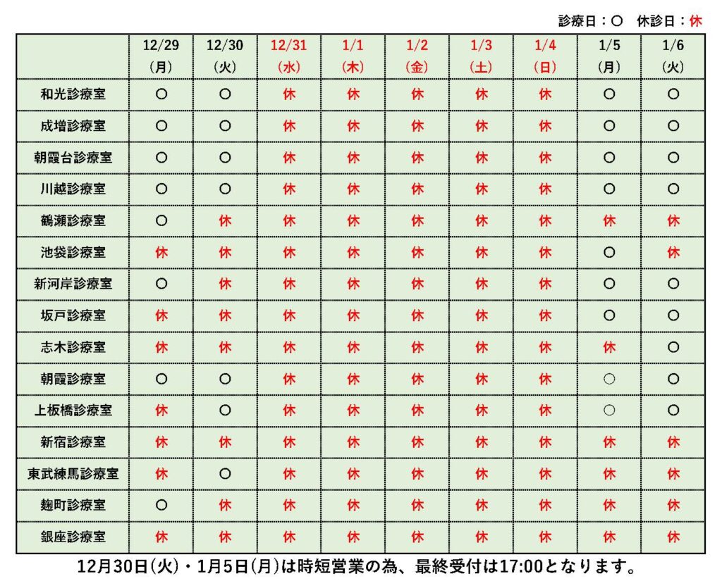 冬季休暇について 2025.12/05 最終更新日時 : 2025.12/05 takedaHP_staff 冬季休暇による休診のお知らせです。 皆様には大変ご迷惑をお掛け致しますが ご理解・ご協力の程宜しくお願いいたします。